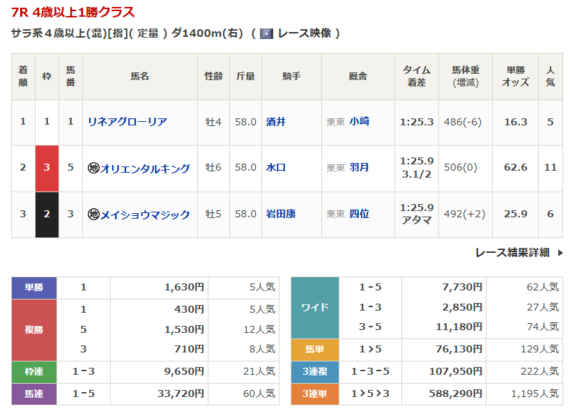 このレースでは◎フレイム(9番人気)2着と◎ライヴドライバー(5番人気)3着に入り穴馬がダブルで好走しました。相手馬の★ラストシャリナ(2番人気)が1着に入ったことで馬連は4,010円、穴馬同士のワイドは6,260円、3連複は34,580円、3連単は81,120円とパーフェクト的中となりました。