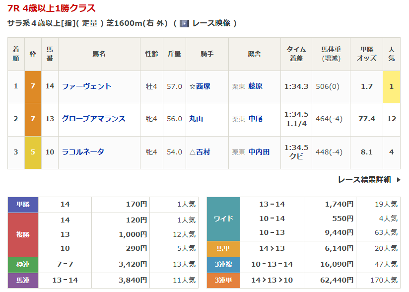 ◎ゴールドパートナー(7人気)3着 複勝340円