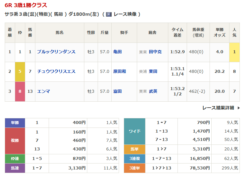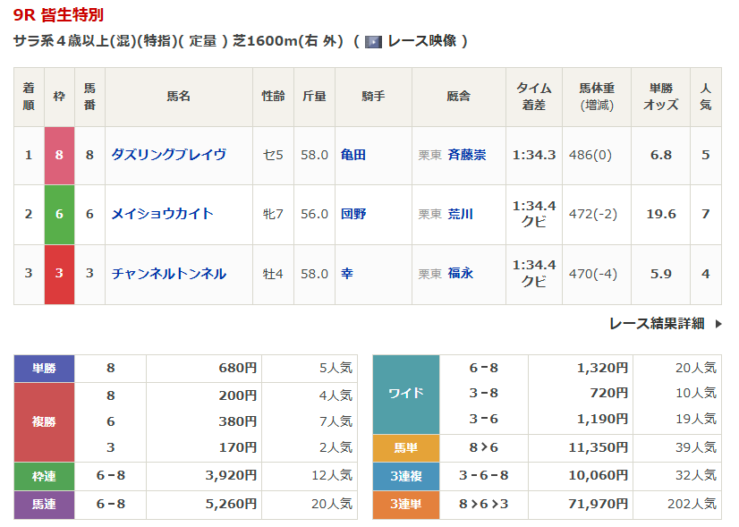 ◎ダズリングブレイヴ(5人気)1着 単勝680円、複勝200円