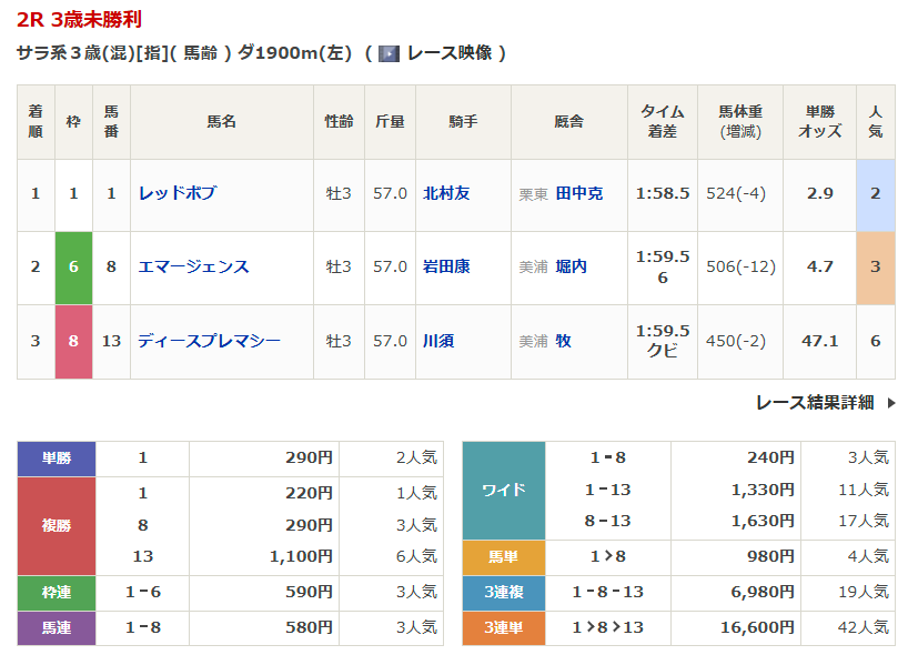 ◎レイズカイザー(5人気)1着 単勝1,100円、複勝270円
