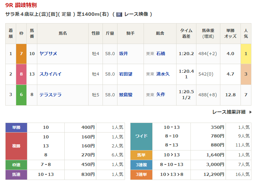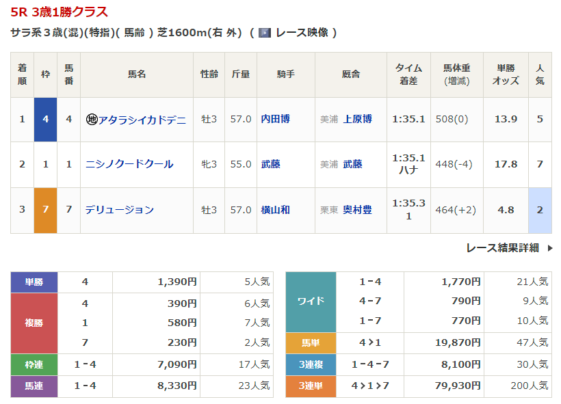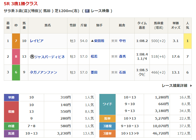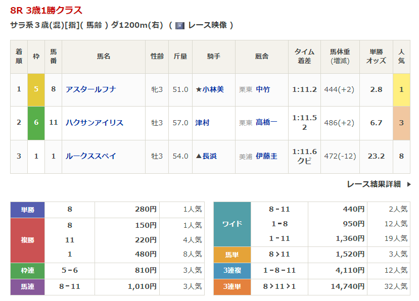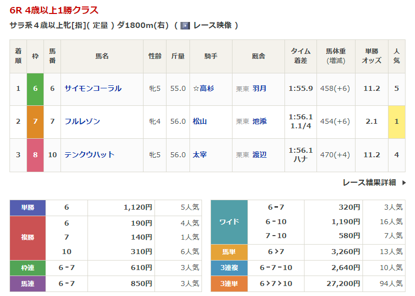◎サイモンコーラル(5人気)1着 単勝1,120円、複勝190円