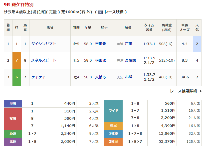 ◎マサノユニコーン(9人気)1着 単勝1,820円、複勝440円 - 3/9【中山7R】4歳以上1勝クラス