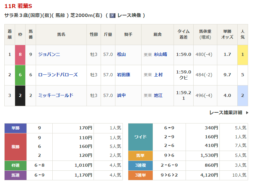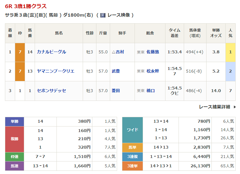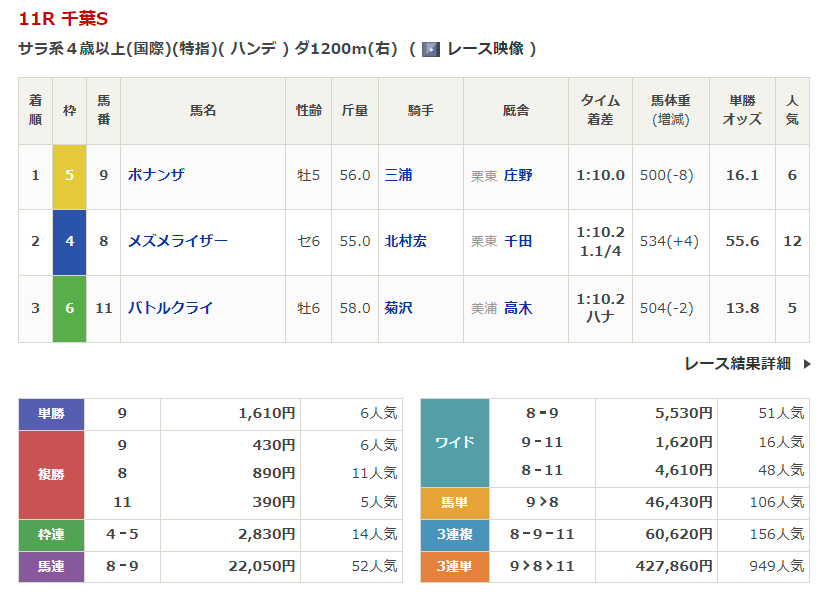 ◎ボナンザ(6人気)1着 単勝1,610円、複勝430円