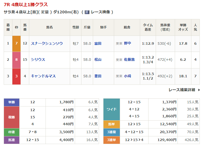 ◎スナークシュンソウ(6人気)1着 単勝1,780円、複勝410円