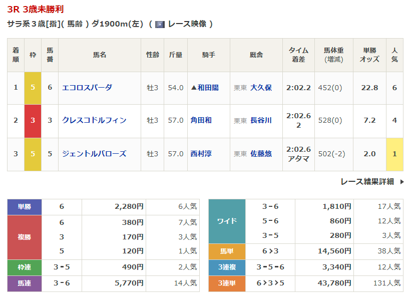 ◎エコロスパーダ(6人気)1着 単勝2,280円、複勝380円