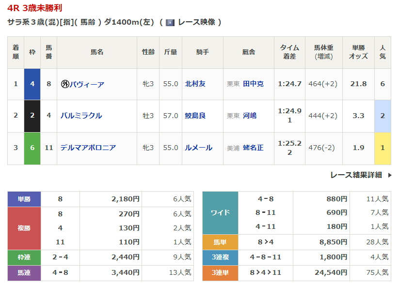 ◎パヴィーア(6人気)1着 単勝2,180円、複勝270円