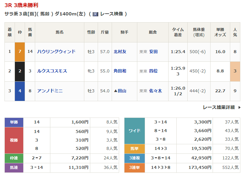 ◎ハウリングウィンド(8人気)1着 単勝1,600円、複勝560円