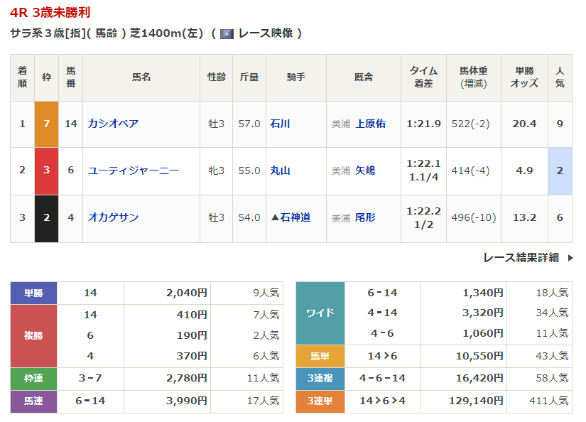 ◎カシオペア(9人気)1着 単勝2,040円、複勝410円