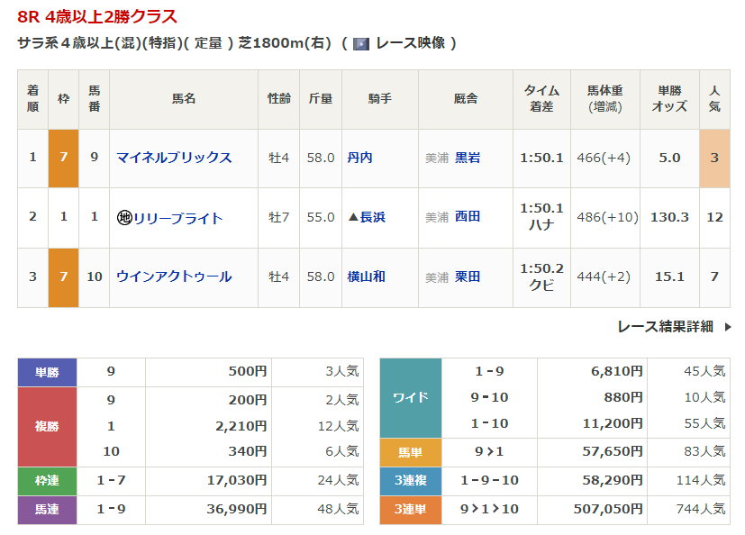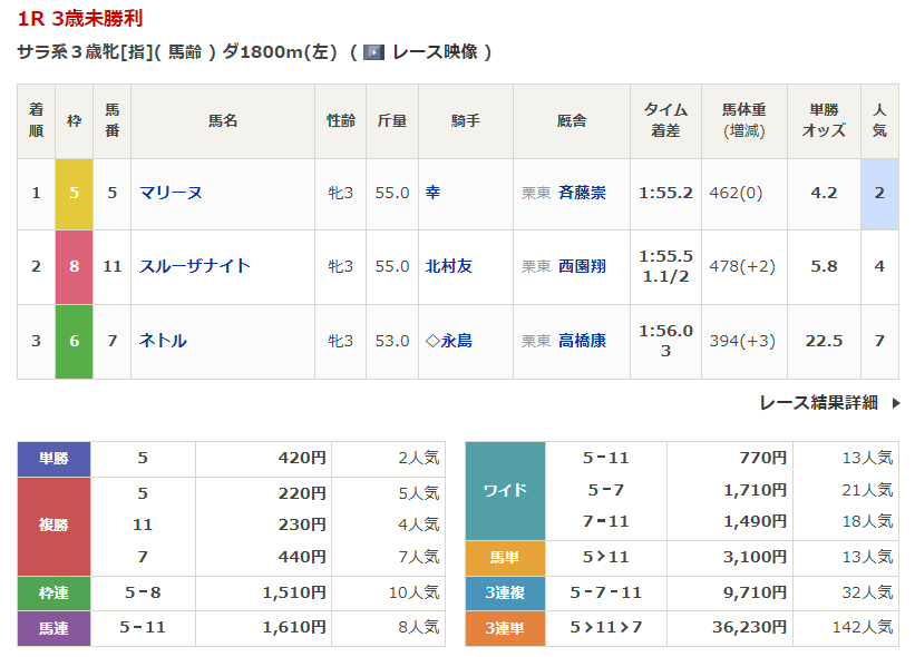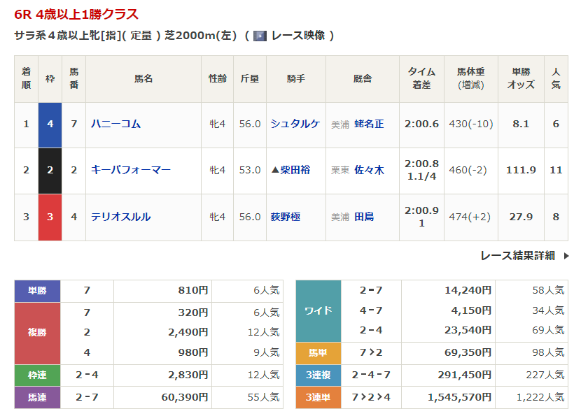 ◎マテンロウブラボー(5人気)1着 単勝860円、複勝330円