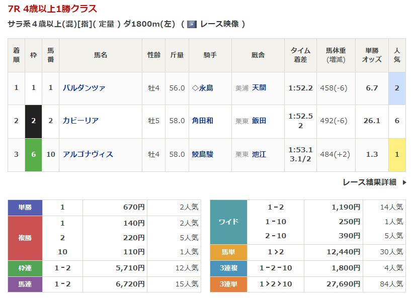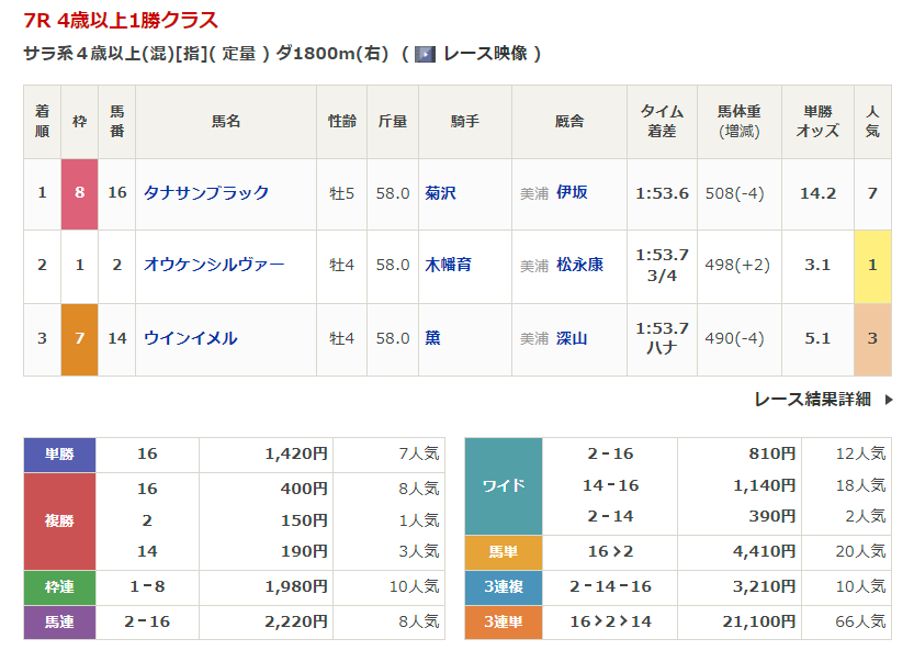 ◎タナサンブラック(7人気)1着 単勝1,420円、複勝400円