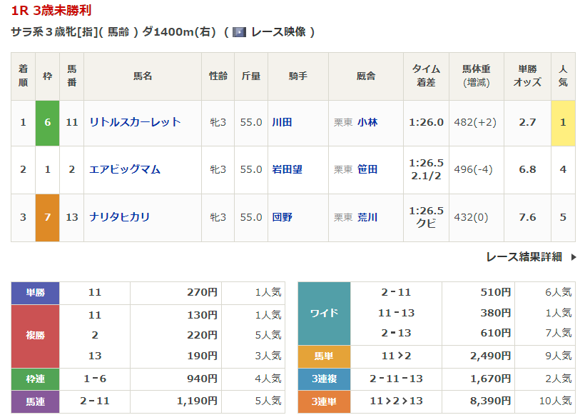 ◎リトルスカーレット(4人気)3着 複勝280円