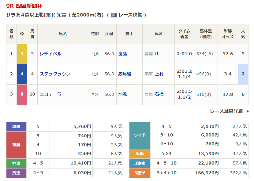 ◎ボナンザ(6人気)1着 単勝1,610円、複勝430円
