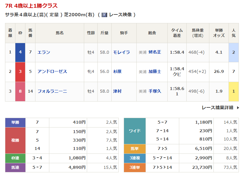 ◎アンドローゼス(7人気)2着 複勝330円
