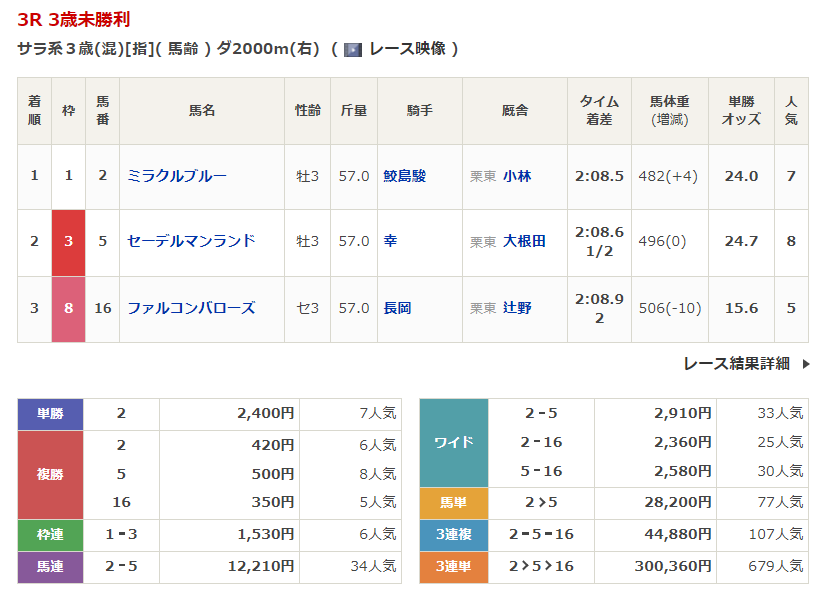◎ミラクルブルー(7人気)1着 単勝2,400円、複勝420円