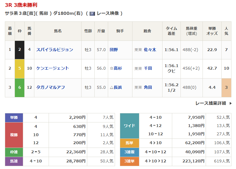 ◎スパイラルビジョン(7人気)1着 単勝2,290円、複勝630円 - 4/20【阪神5R】3歳未勝利