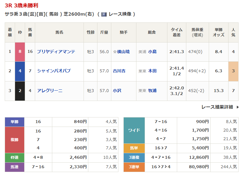 ◎ブリヤディアマンテ(4人気)1着 単勝840円、複勝280円