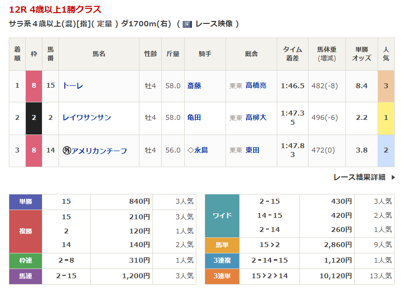 ◎トーレ(3人気)1着 単勝840円、複勝210円