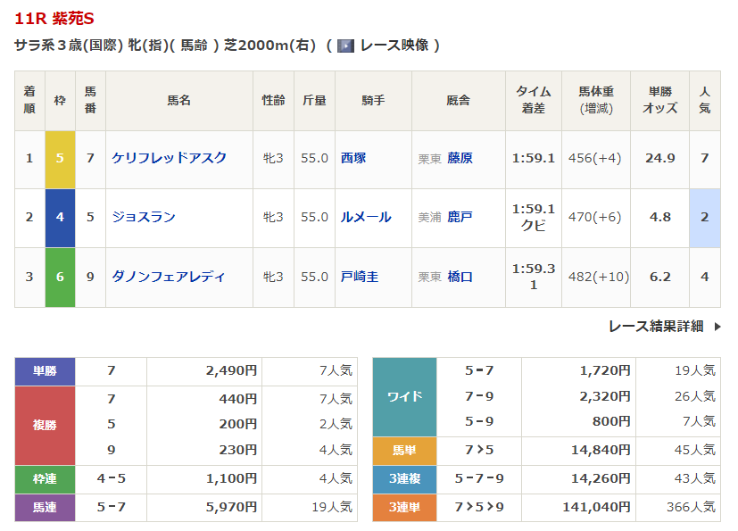 ◎ケリフレッドアスク(7人気)1着 単勝2,490円、複勝440円