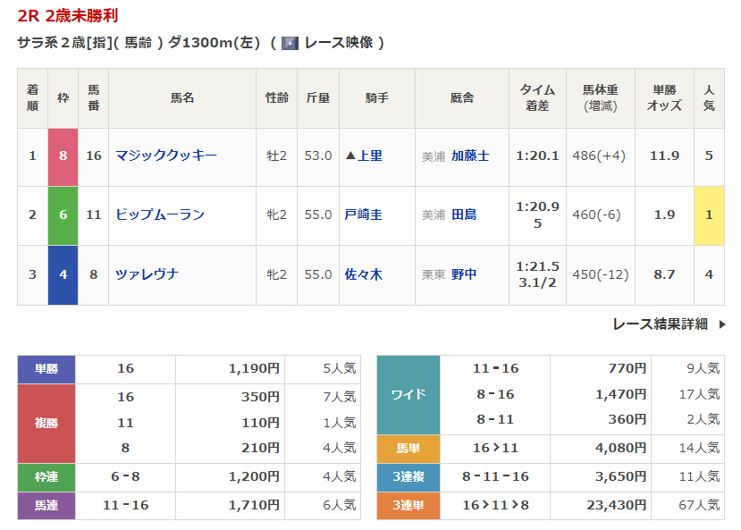 ◎マジッククッキー(5人気)1着 単勝1,190円、複勝350円