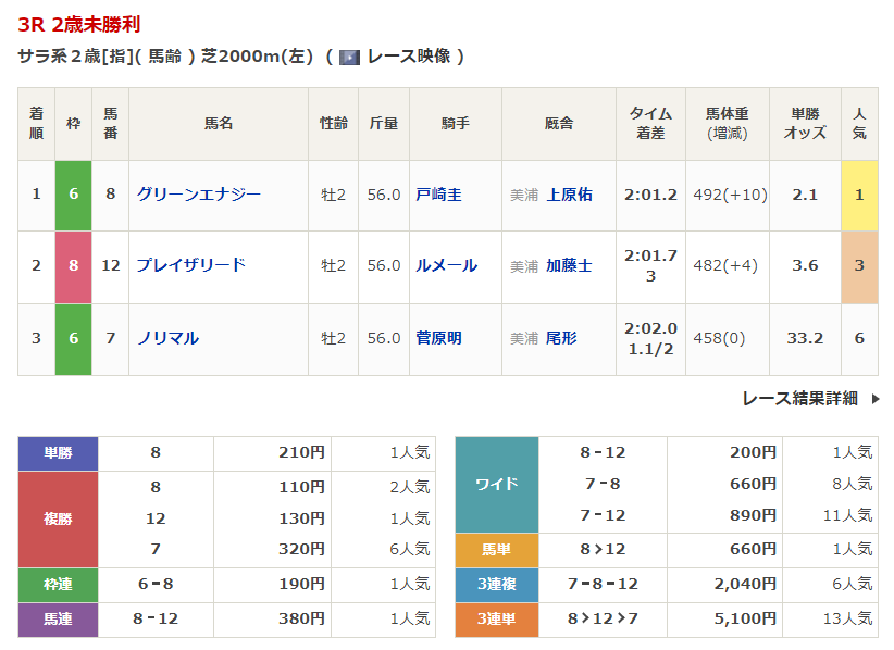 ◎オリバナム(6人気)1着 単勝2,100円、複勝530円 - 11/2【東京2R】2歳未勝利