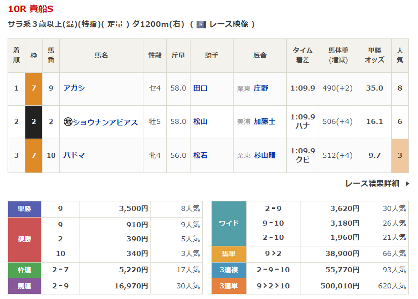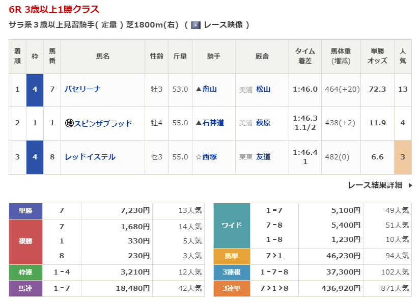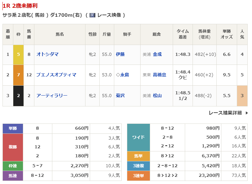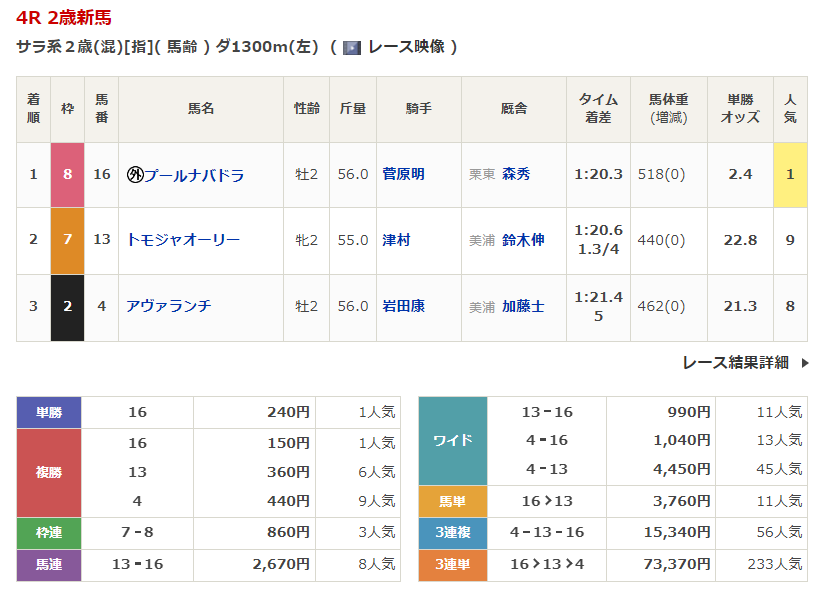 ◎バンディート(4人気)1着 単勝860円、複勝300円