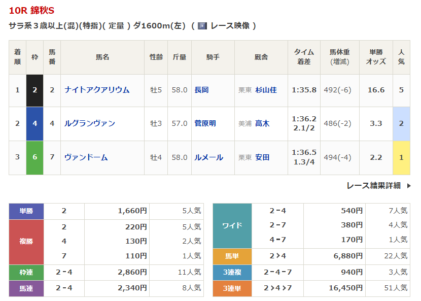 ◎ナイトアクアリウム(5人気)1着 単勝1,660円、複勝220円