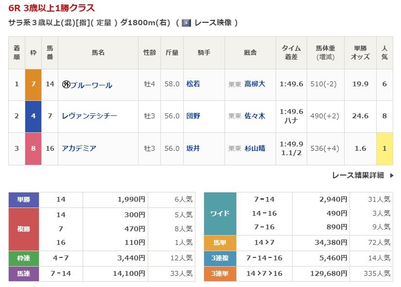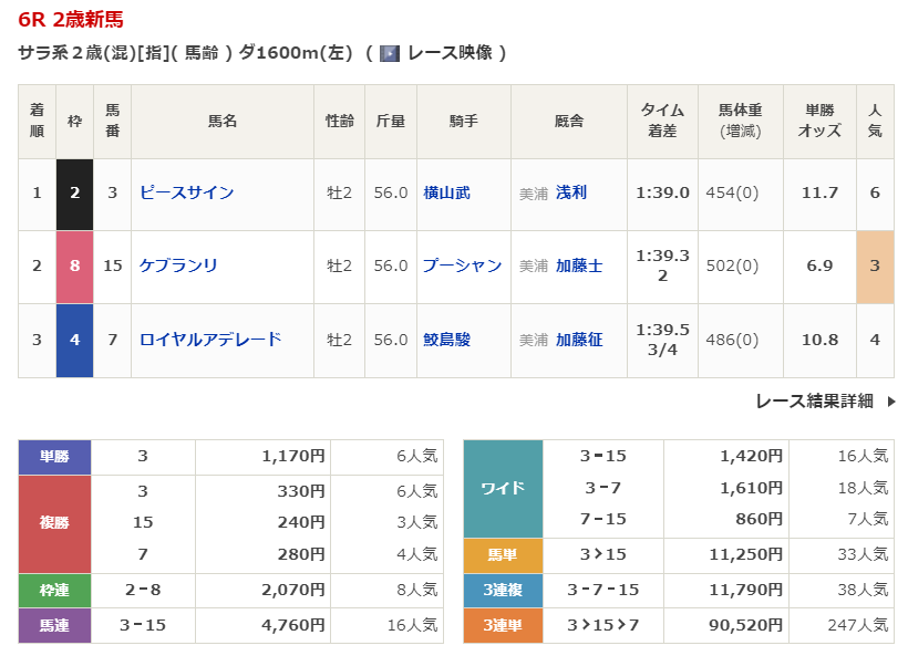 ◎ローディアマント(6人気)1着 単勝1,780円、複勝280円