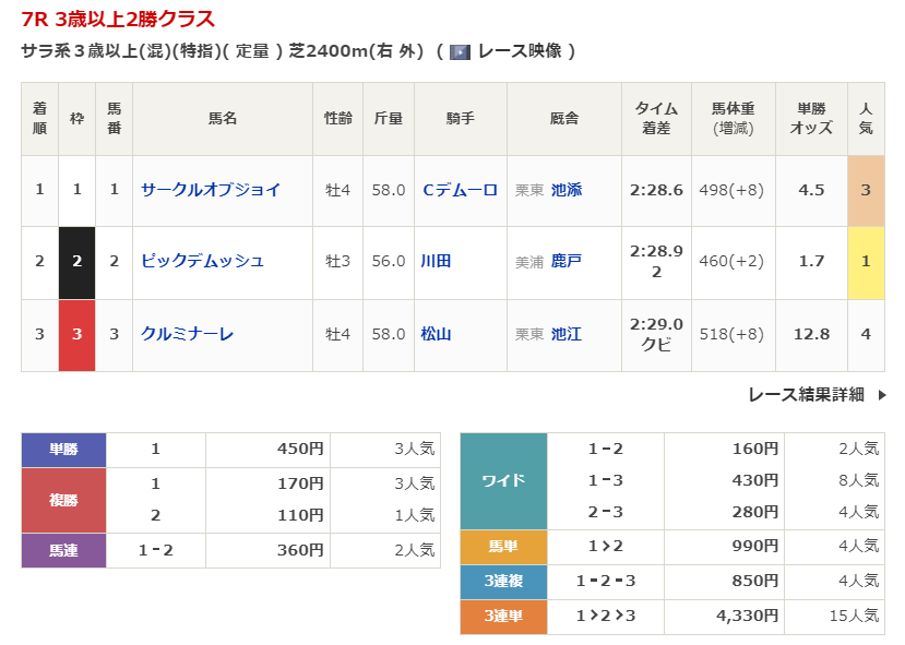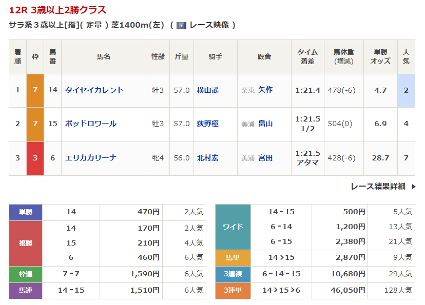 11/9 東京12R 3歳以上2勝クラス 芝1400m