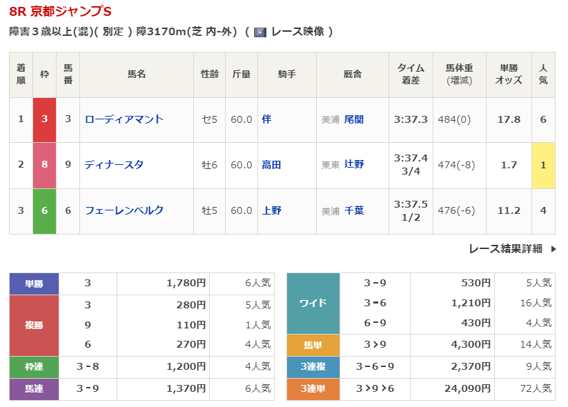 ◎ナイトアクアリウム(5人気)1着 単勝1,660円、複勝220円 - 11/8【京都8R】京都ジャンプステークス