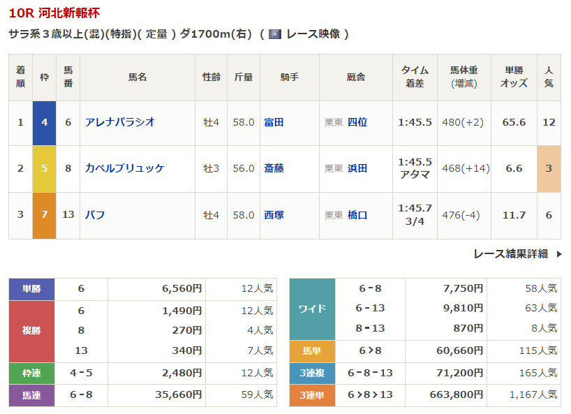 ◎アレナパラシオ(12人気)1着 単勝6,560円、複勝1,490円