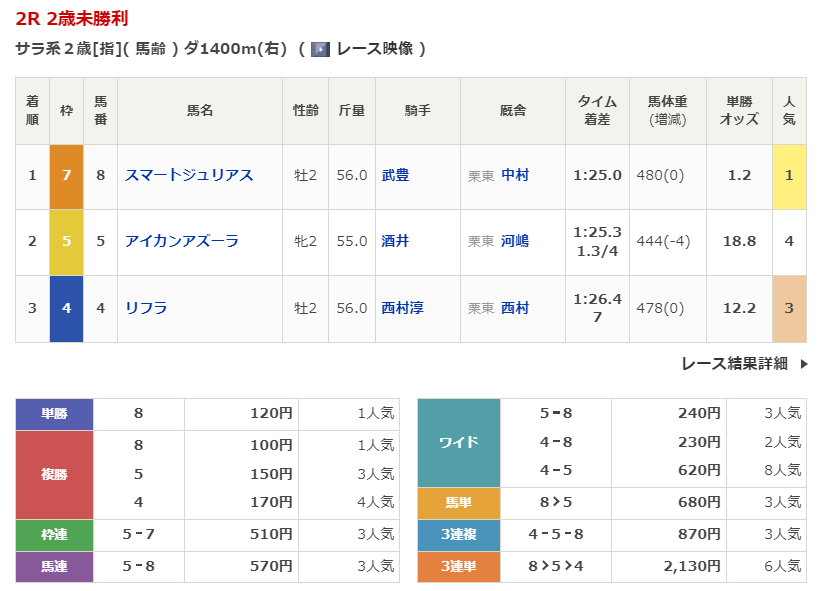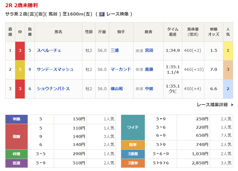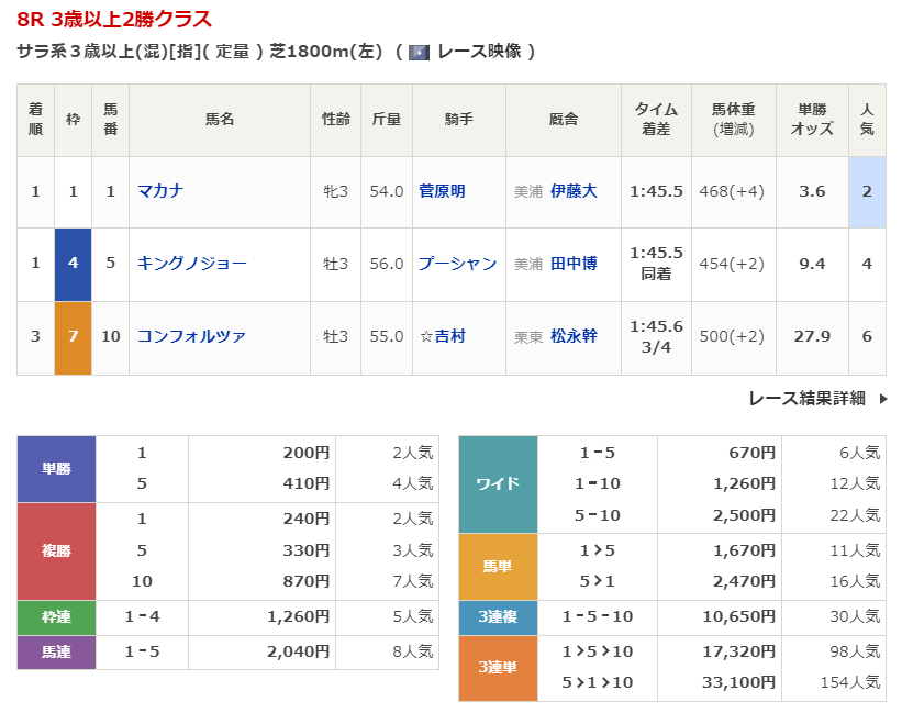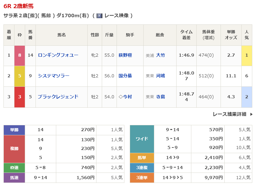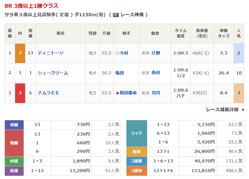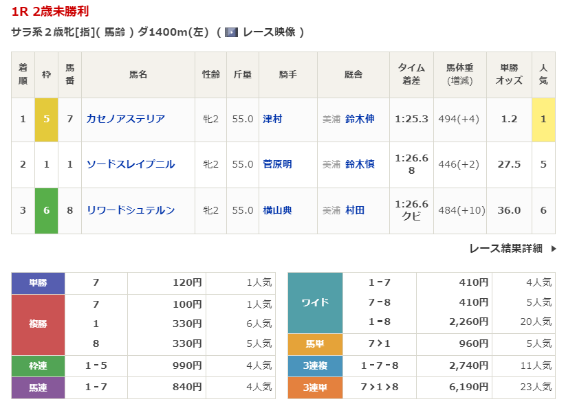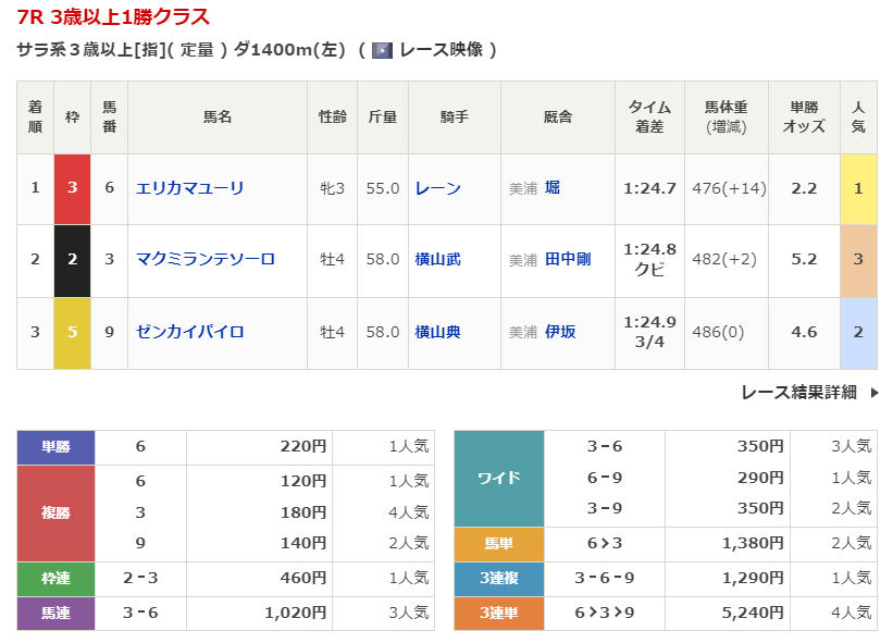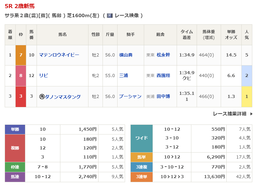 ◎マテンロウネイビー(5人気)1着 単勝1,450円、複勝180円