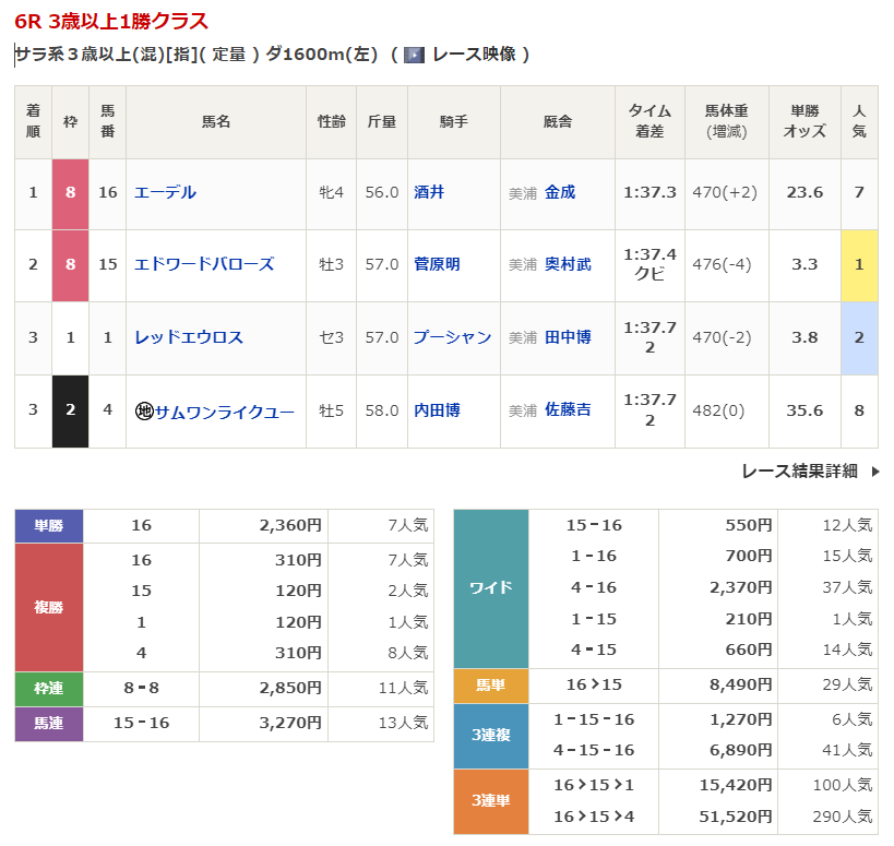 ◎エーデル(7人気)1着 単勝2,360円、複勝310円