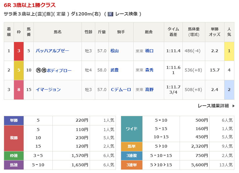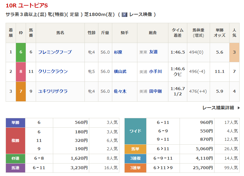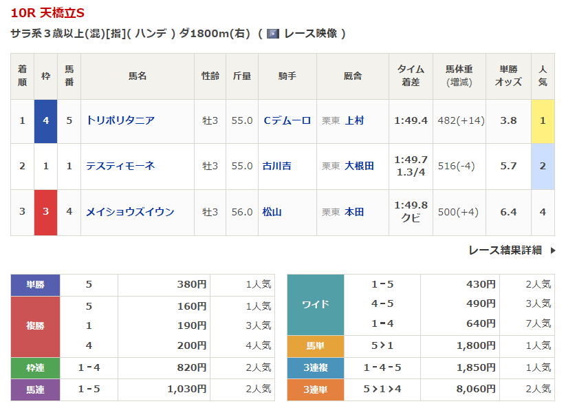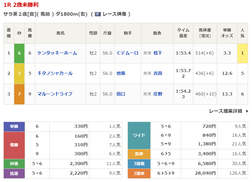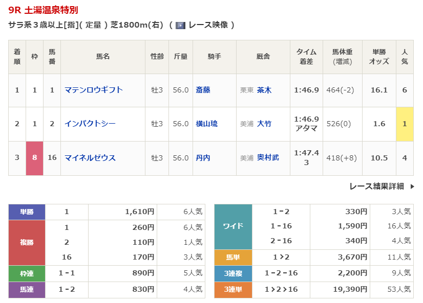 ◎マテンロウギフト(6人気)1着 単勝1,610円、複勝260円