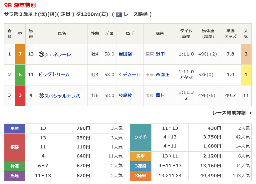 ◎ジェネラーレ(3人気)1着 単勝780円、複勝250円