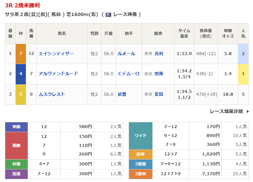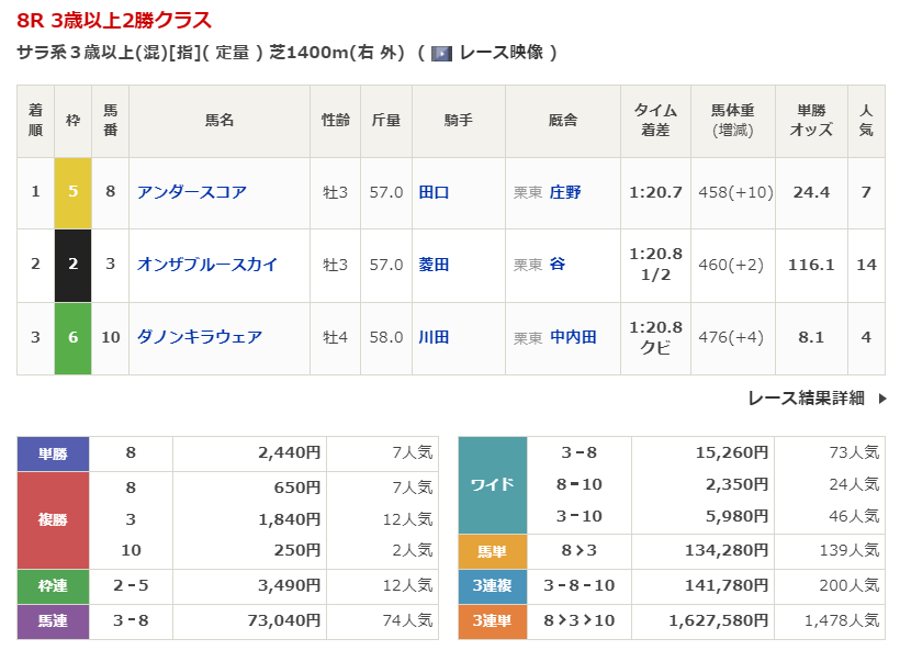 ◎アンダースコア(7人気)1着 単勝2,440円、複勝650円