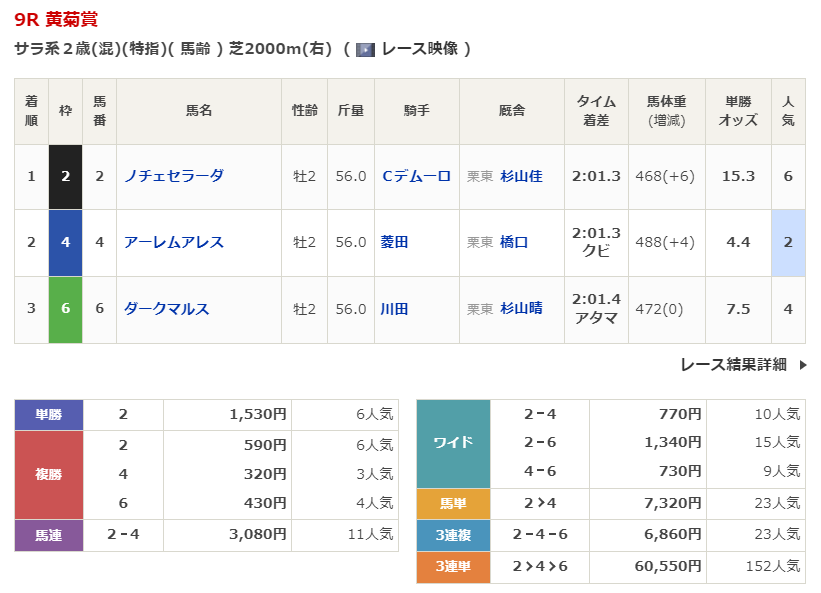 ◎アンダースコア(7人気)1着 単勝2,440円、複勝650円 - 11/16【京都9R】黄菊賞