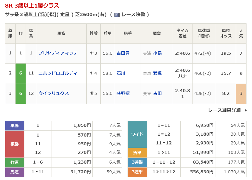 ◎ブリヤディアマンテ(7人気)1着 単勝1,950円、複勝570円 - 11/15【福島9R】土湯温泉特別