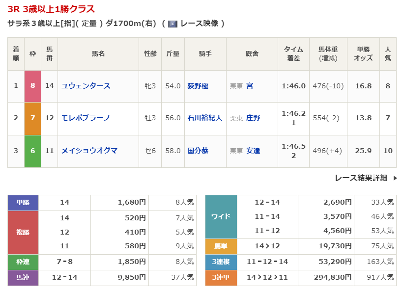 ◎ユウェンタース(8人気)1着 単勝1,680円、複勝520円