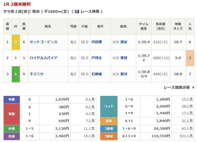 ◎セントゴーデンス(6人気)1着 単勝1,070円、複勝380円