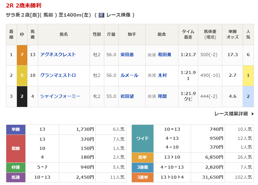 ◎アグネスクレスト(6人気)1着 単勝1,730円、複勝370円