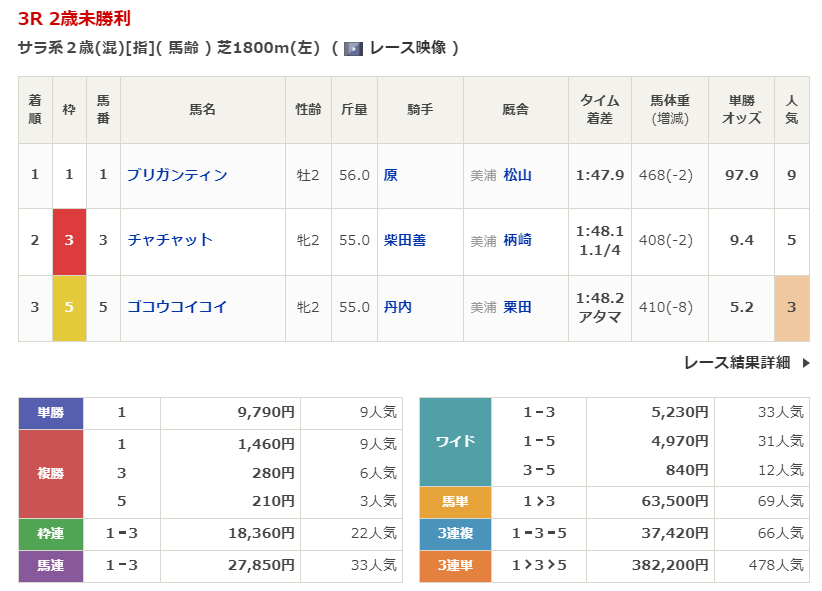 ◎オリバナム(6人気)1着 単勝2,100円、複勝530円 - 11/2【東京2R】2歳未勝利