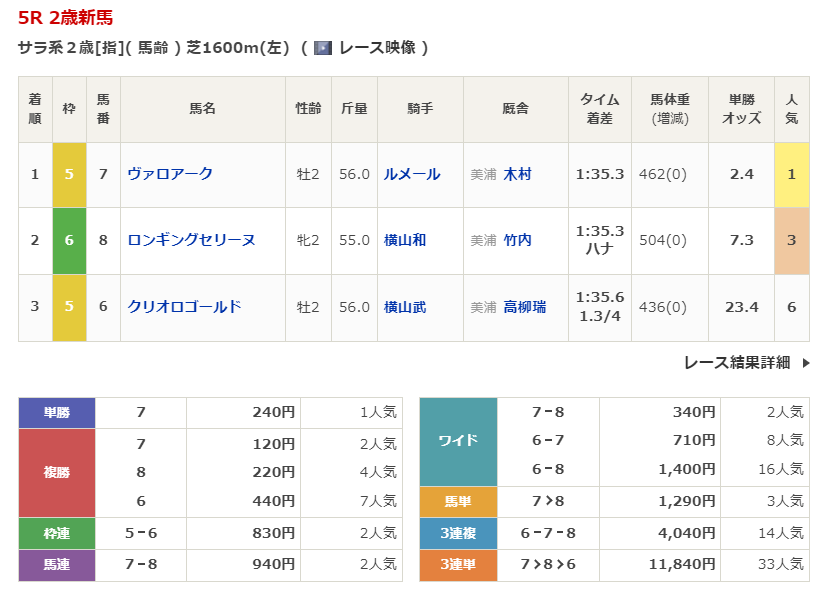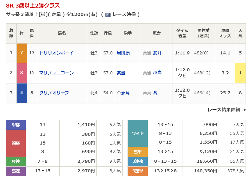 ◎マテンロウネイビー(5人気)1着 単勝1,450円、複勝180円