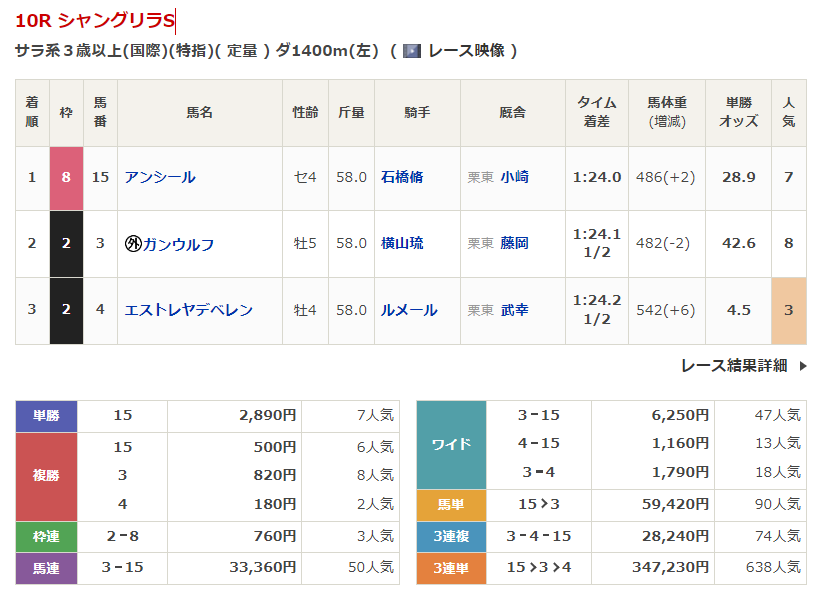 ◎アンシール(7人気)1着 単勝2,890円、複勝500円
