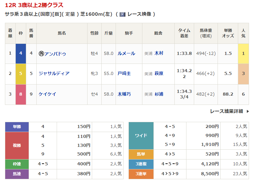 ◎ショウナンアンバー(5人気)3着 複勝150円