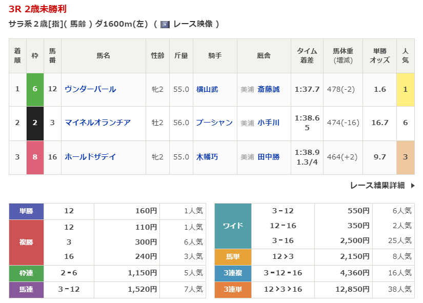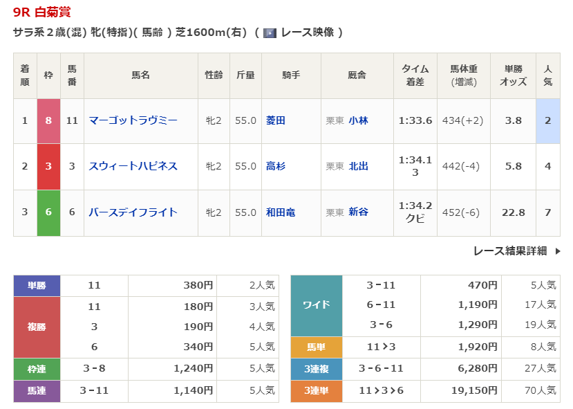◎マテンロウギフト(6人気)1着 単勝1,610円、複勝260円 - 11/16【東京5R】2歳新馬