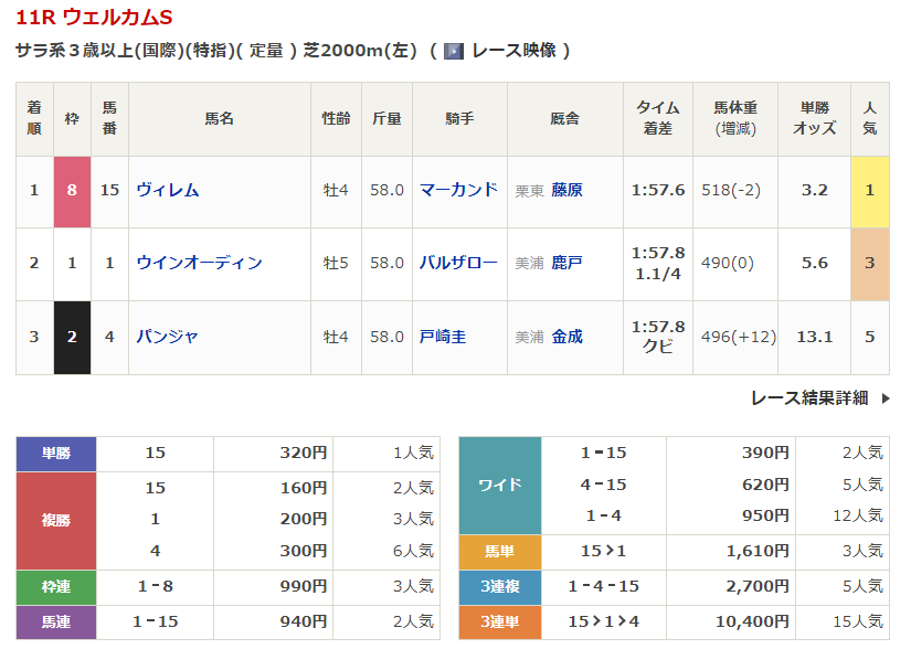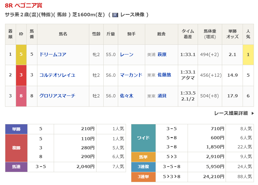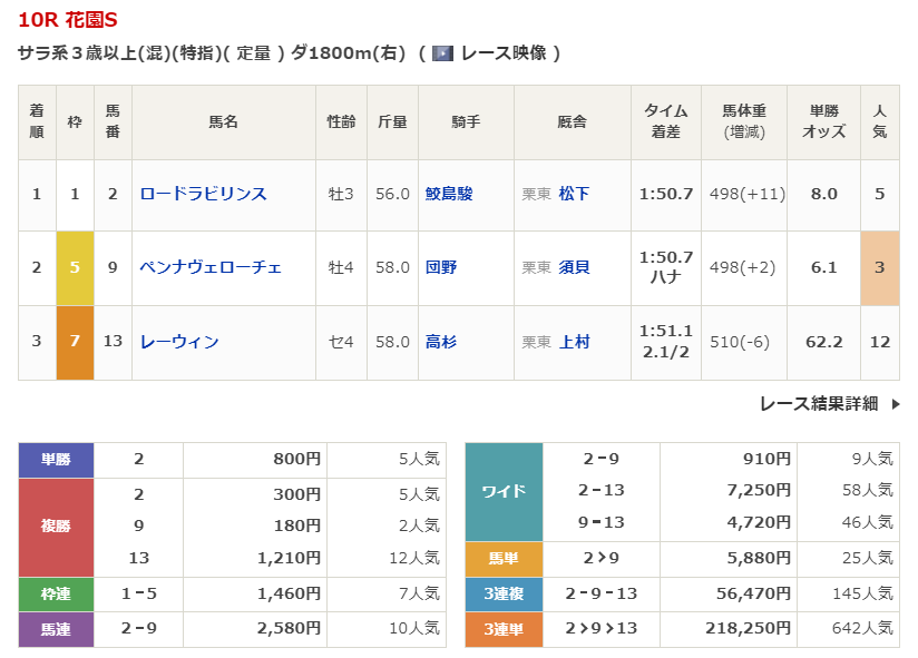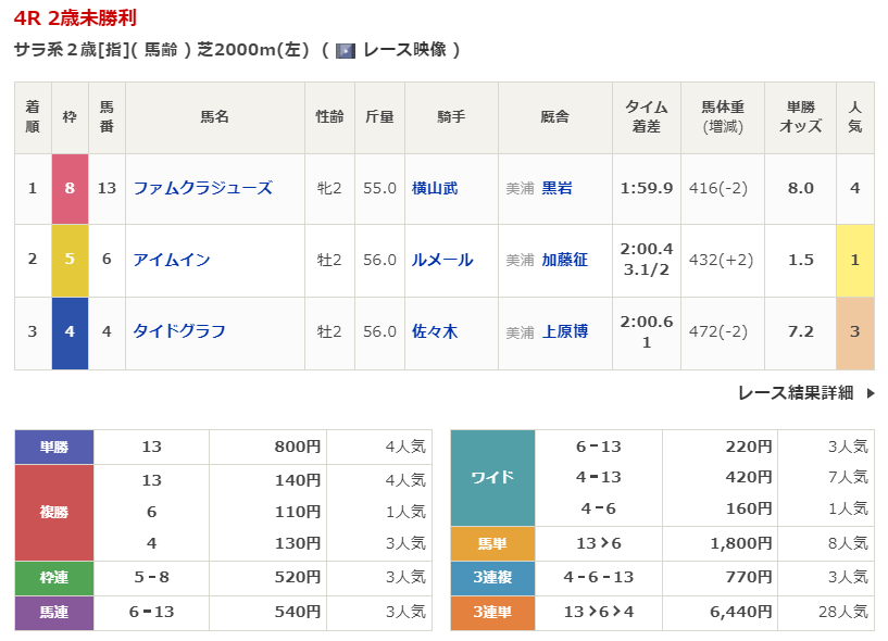 ◎ファムクラジューズ(4人気)1着 単勝800円、複勝140円