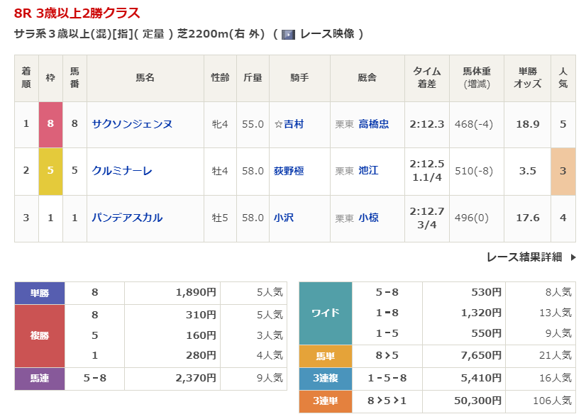 ◎サクソンジェンヌ(5人気)1着 単勝1,890円、複勝310円