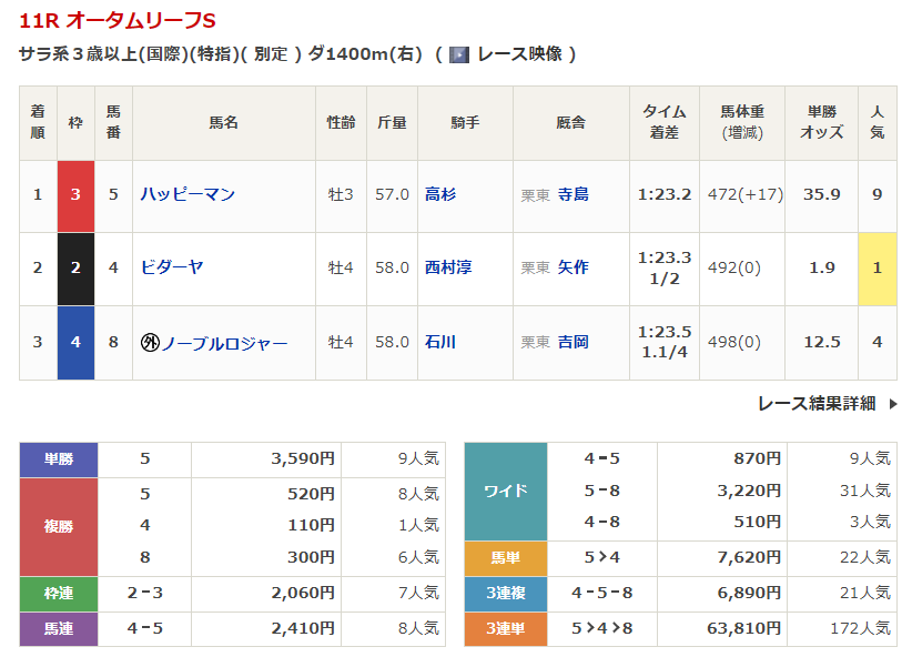 ◎ノーブルロジャー(4人気)3着 複勝300円