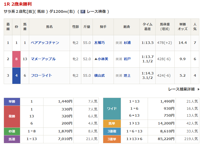 ◎マメーアップル(6人気)2着 複勝320円 - 12/13【中山2R】2歳未勝利
