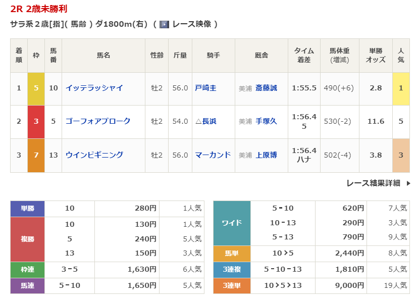 ◎ゴーフォアブローク(5人気)2着 複勝240円 - 12/13【中山4R】2歳未勝利